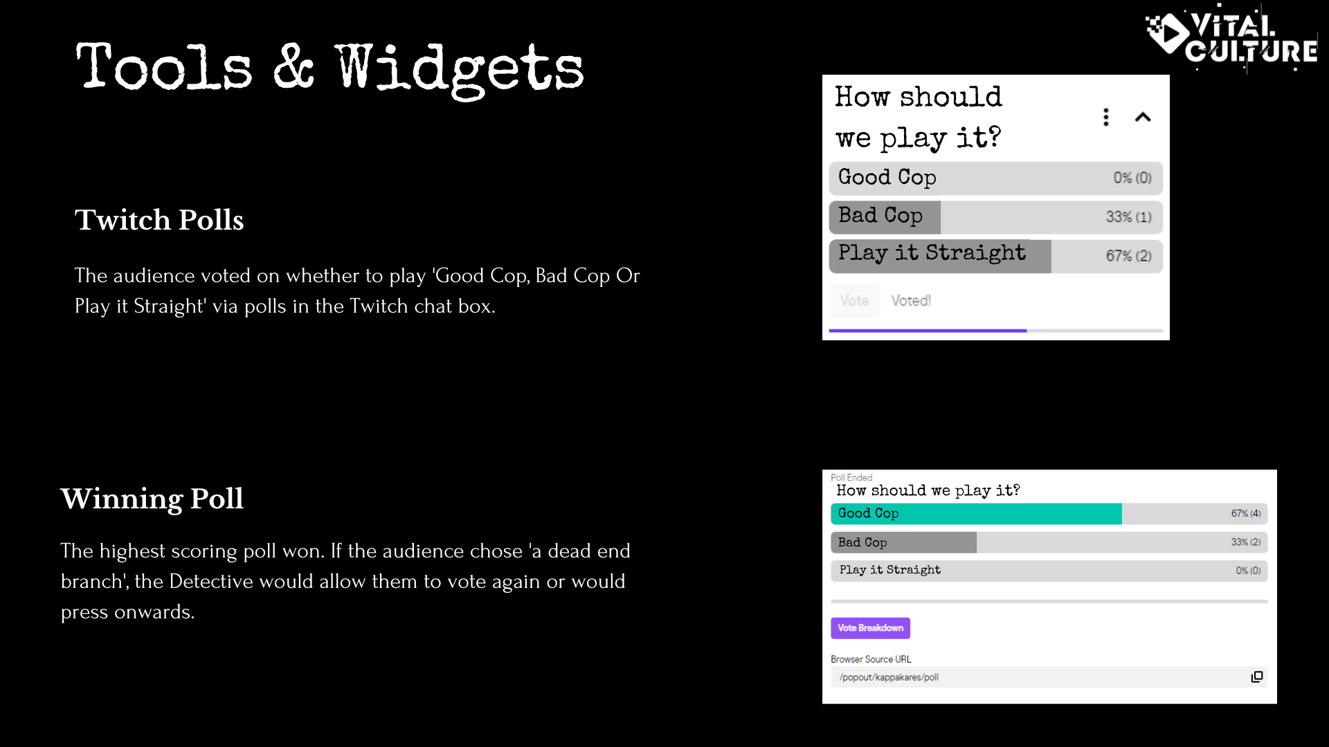 Each Vital Stories edition combines live theatre and digital tools such as Twitch polls, chat interactions, and evidence databases.